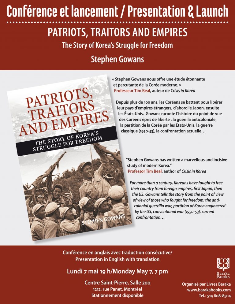 Baraka Books invites you to a presentation by Stephen Gowans and the launch of his new book, Patriots, Traitors and Empires, The Story of Korea’s Struggle for Freedom, on Monday, May 7, at 7 pm at the Centre Saint-Pierre, Salle 200, 1212, rue Panet, à Montréal.